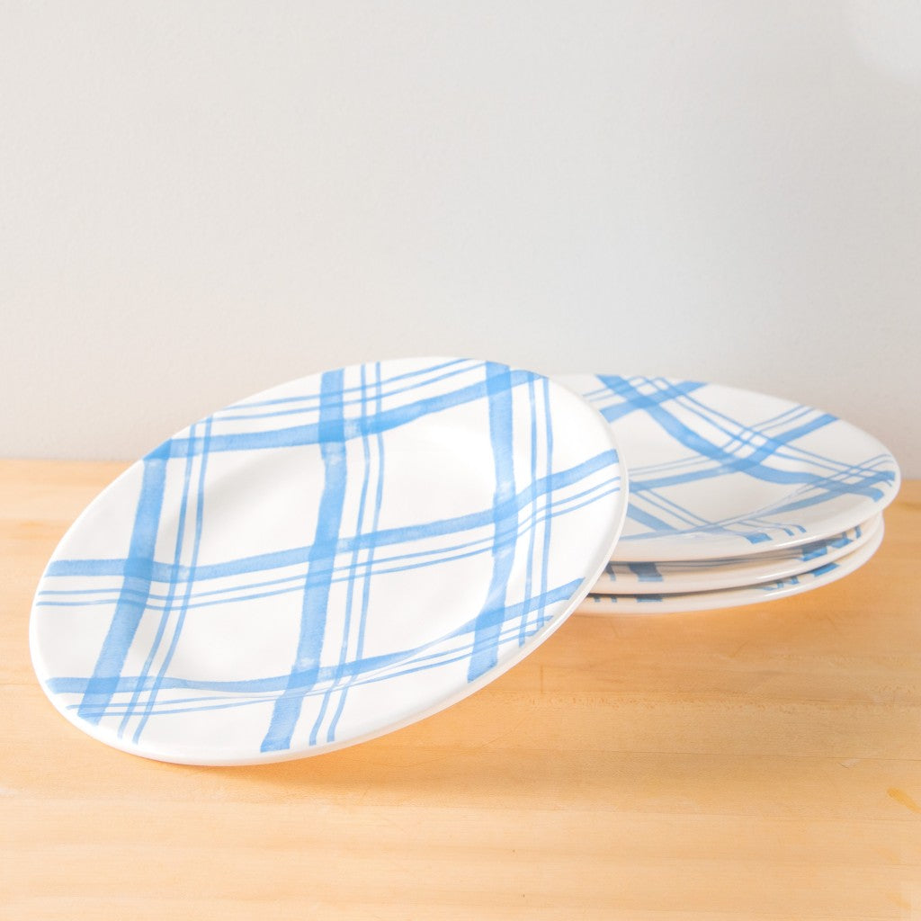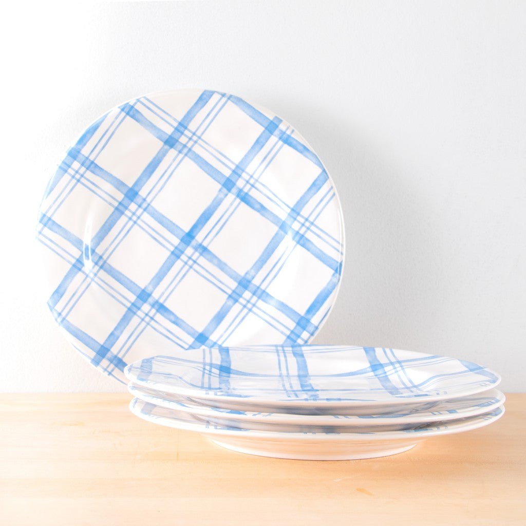 Pier 1's Country Blue Plaid Dinnerware Collection combines classic blue with a soft watercolor plaid. Pretty enough for guests, our ironstone pieces work for family meals, too- they're dishwasher-safe and can be used in the microwave. Dinner plates are sold in a set of 4.